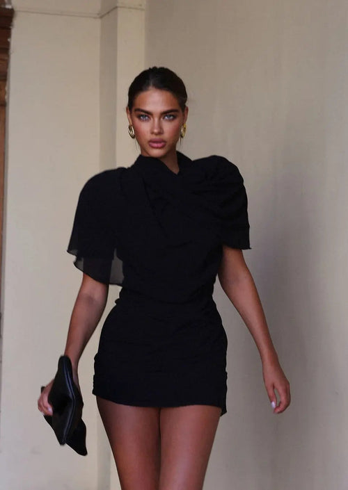 Carmen | Zwarte Drapé-Minikleed met Hoge Schouderpartij